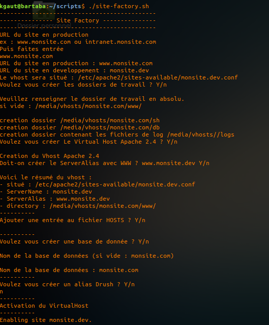 Une fois exécute dans un terminal, le script vous demandera l'adresse en production du site sur lequel vous voulez travailler. À partir de ça, il créera le dossier de travail, le Virtual Host apache2, créera la base de donnée mysql, activera le vhost changera les droits sur le dossier de travail et enfin vous proposera de créer un alias drush (si vous travailler sous drupal).