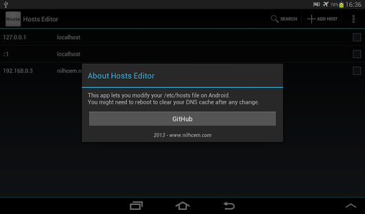 Sur Android, le fichier HOSTS est protégé, il faut donc avoir un téléphone rooté (débloqué) afin de pouvoir y accèder, mais l'application host editor permet de simplifier le processus :