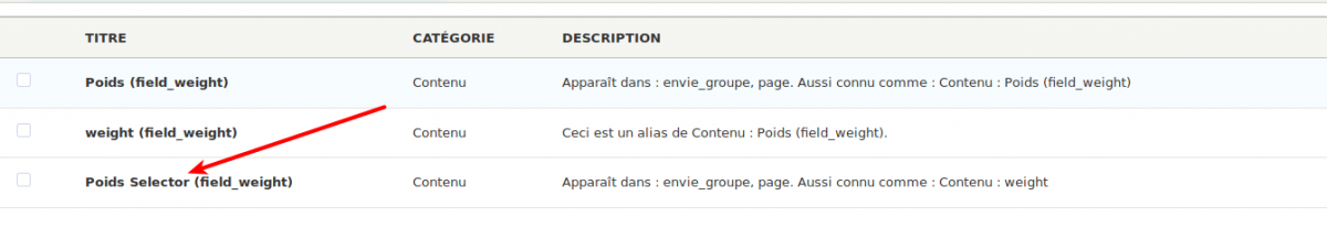 Ajoutons aux champs, le champs "poids" que nous avons créé, afin d'avoir la petite flèche multidimensionnelle pour réordonner. Attention il faut bien prendre l'élément "Selector" si l'on sélectionne l'autre, alors on aura juste une cellule dans le tableau nous indiquant le poids du contenu, ce n'est pas ce que l'on veut ici :