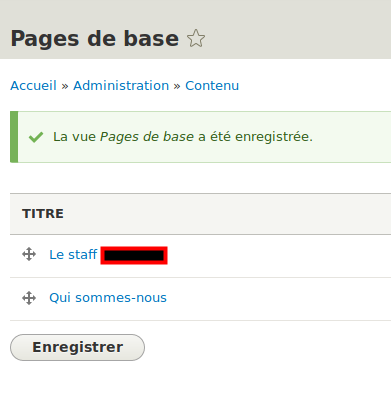 Enregistrez votre vue et rendez-vous sur la page crée, vous pouvez maintenant réordonner vos contenus comme vous le souhaiter, en pensant bien à enregistrer.