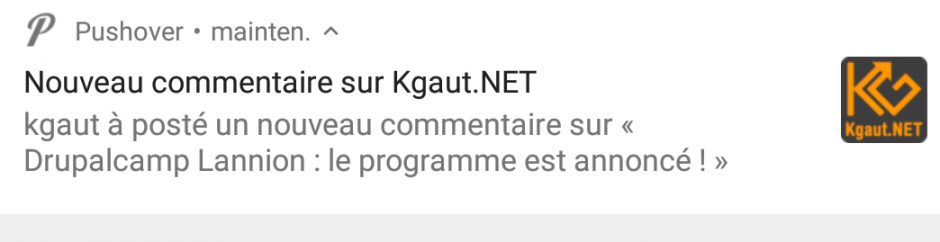 \Drupal::service('pushover.sender')->sendNotification($title, $message, $url = NULL, $url_title = NULL); Un exemple d'intégration pour envoyer une notification lors d'un nouveau commentaire : /** * Implements hook_HOOK_insert(). * * Send Pushover notification on new comment. * * @param \Drupal\comment\Entity\Comment $comment */ function kgaut_comment_insert(\Drupal\comment\Entity\Comment $comment) { $node = $comment->getCommentedEntity(); $author = $comment->getAuthorName(); $title = t('Nouveau commentaire sur Kgaut.NET'); $description = t('@name à posté un nouveau commentaire sur « @post_title »', [ '@name' => $author, '@post_title' => $node->label(), ]); $url = $node->url('canonical',['absolute' => TRUE]); \Drupal::service('pushover.sender')->sendNotification($title, $description, $url, t('Voir le post')); }