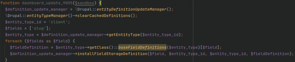 Voici comment ajouter un basefield slug à un type d'entité client. La définition de cette propriété se trouvant dans la méthode baseFieldDefinitions de notre type d'entité :