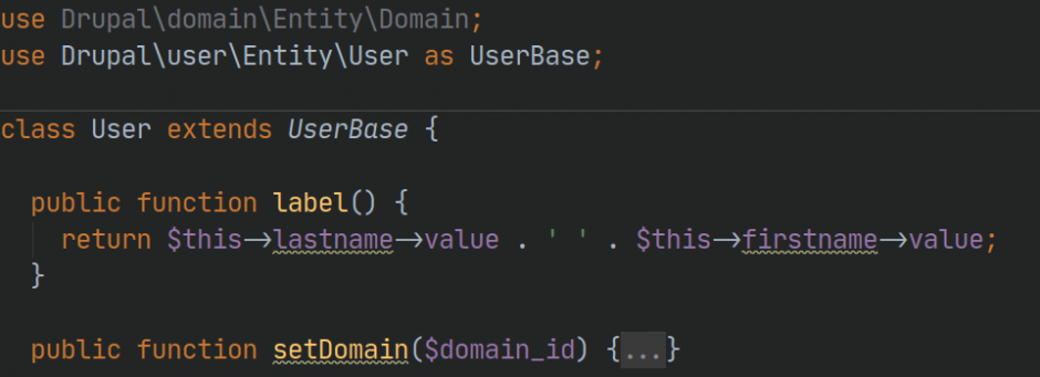 Sous Drupal 8 il est possible de surcharger la classe du type d'entité « User » afin de par exemple ajouter nos propres getters et setters ou de modifier l'affichage par défaut d'un nom d'utilisateur.