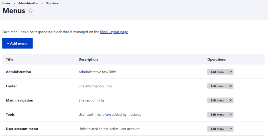 Dans Drupal, les éléments de menu sont gérés soit via l'interface d'administration soit dans les fichiers mon_module.links.menu.yml, de la manière suivante :
