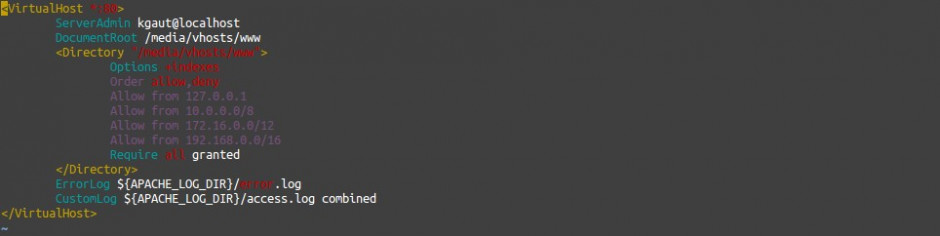 <VirtualHost *:80> ServerAdmin kgaut@localhost DocumentRoot /media/vhosts/www <Directory "/media/vhosts/www"> Options +indexes Order allow,deny Allow from 127.0.0.1 Allow from 10.0.0.0/8 Allow from 172.16.0.0/12 Allow from 192.168.0.0/16 Require all granted </Directory> ErrorLog ${APACHE_LOG_DIR}/error.log CustomLog ${APACHE_LOG_DIR}/access.log combined </VirtualHost>