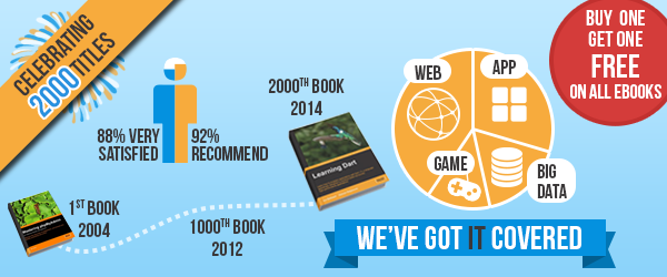 Une petite brève pour signaler l'opération de la maison d’édition Packt Publishing, qui, pour la publication de son 2000eme livre propose pour l'achat d'un ebook, un ebook au choix gratuit.