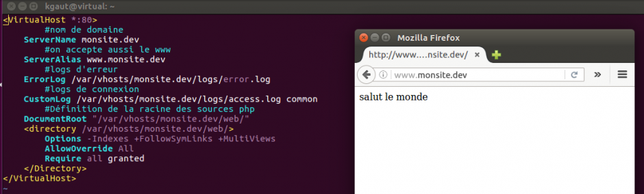 salut! j'ai un probleme avec ce virtual host, j'ai pas d'erreurs , la configuration est bien passée mais lorsque je navigue à mon site , il me dit "unable to connect" ou parfois "ce site n'existe pas" svp j'ai besoin d'aide :) !!