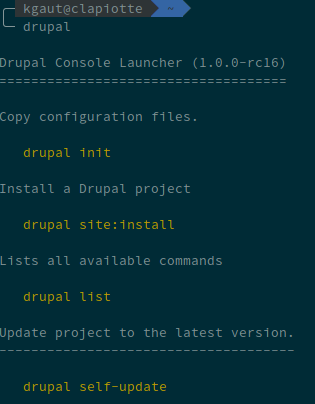 Pour vérifier que l'outil est bien disponible, lancez la commande "drupal" depuis un terminal, et vous devriez avoir quelque chose comme ça :