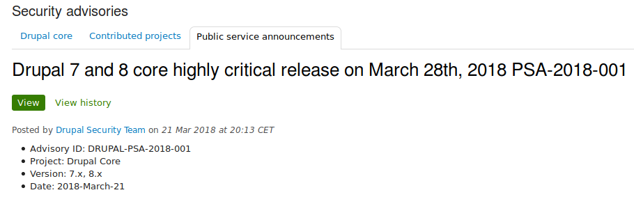 Il vient d'être annoncé par l'équipe gérant la sécurité du CMS drupal qu'un gros correctif de sécurité pour drupal 7 et drupal 8 sera déployé mercredi 28/03/2018 entre 20h et 21h30 (heures Françaises). [Edit du 27/03/2018 : j'avais oublié le paramètre « heure d'été » dans mes conversions de timezones...]
