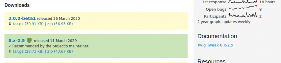 En outre, il en sera bientôt terminé des versions de module "8.x-1.0", le versionnement sémantique est adopté et est compatible à partir de drupal 8.8.3, C'est à dire que les nouvelles branches de vos projets seront nommées 2.0.x (au lieu de 8.x-2.x) et les tags (versions) pourront être sous la forme :