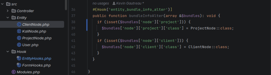 Cela se fait via le hook entity_bundle_info_alter. Utilisons la syntaxe moderne avec les attributs PHP dans une classe dédiée aux hooks :