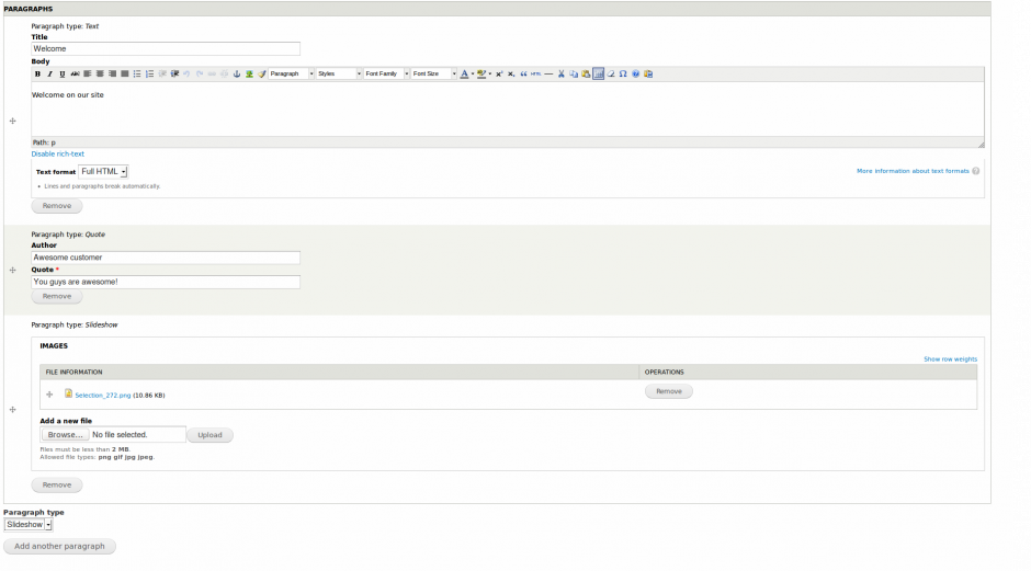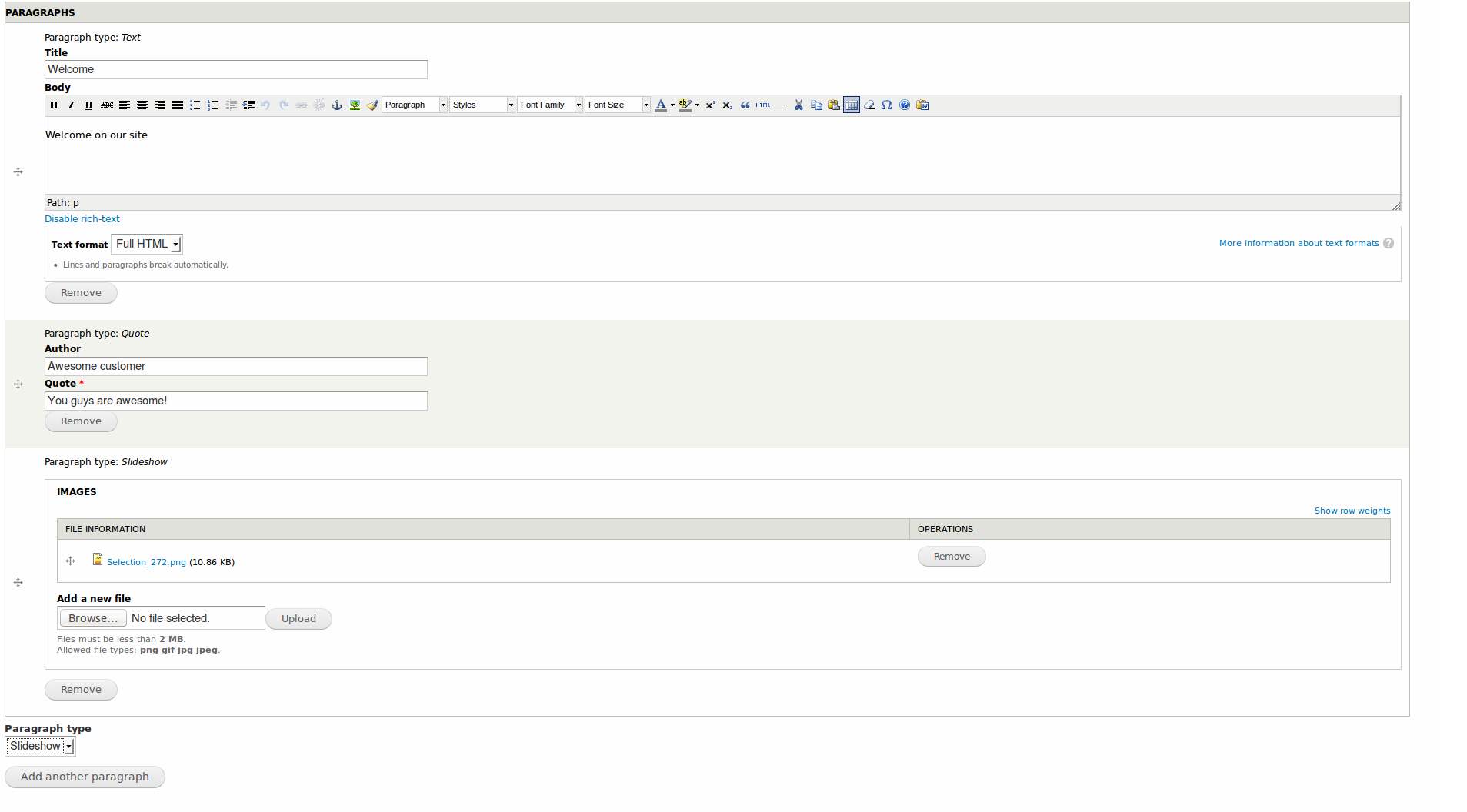 Vous pouvez définir autant de type de paragraphes différents, qui ont chacun leur structure de champs distincte.