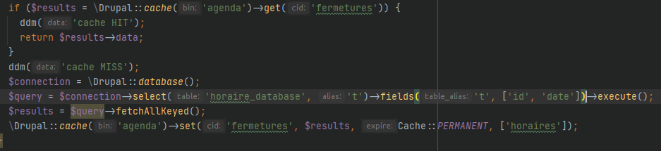 \Drupal::cache('mon_module')->set('fermetures', $results, Cache::PERMANENT, ['horaires']);
