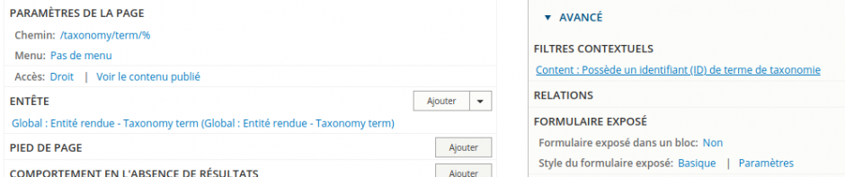 La page par défaut de liste des termes de taxonomie de drupal 8 n'est pas très flexible. Elle peut facilement être substituée à une vue mais dans ce cas on perd le « drag'n'drop » dans le cas d'une arborescence.