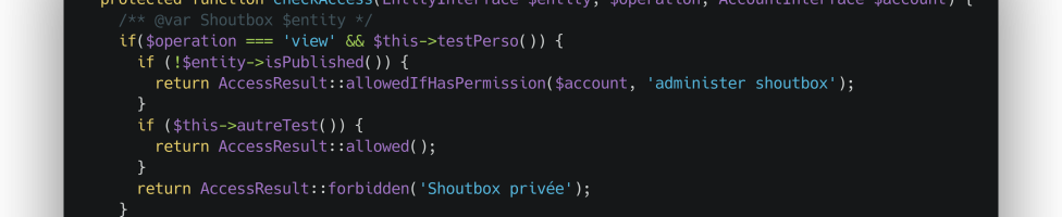 Sous drupal 8, les types d'entités, comme les noeuds, viennent avec leur classe pour gérer le contrôle d'accès (création / modification / visualisation / suppression).