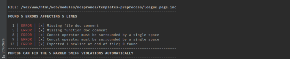 Phpcs (ou PHP Code Sniffer) est un inspecteur de code permettant de vérifier la validité du code écrits en fonction de standards.